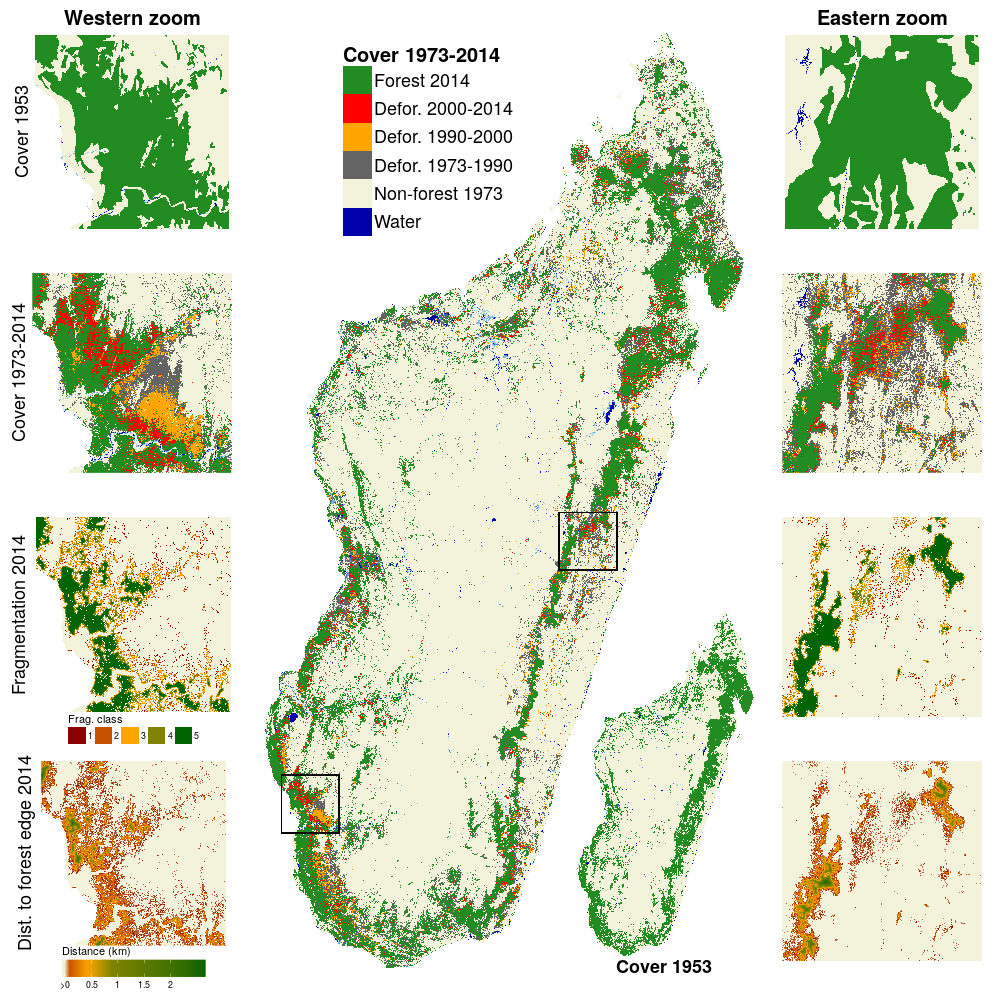 Figure 8: Evolution du couvert forestier à Madagascar sur 60 ans de 1953 à 2014. Les changements de couverture forestière de 1973 à 2014 sont présentés sur la figure principale. Le couvert forestier en 1953 est présenté dans l’encart en bas à droite. Deux séries de zooms sur la forêt sèche de l’ouest (à gauche) et de la forêt humide de l’est (à droite) presentent une vue plus détaillée de (du haut vers le bas): la couverture forestière en 1953, les changements de couverture forestière de 1973 à 2014, la fragmentation de la forêt en 2014 et la distance à la lisière de la forêt en 2014. Les données sur les plans d’eau et leur saisonnalité (bleu foncé pour permanent, bleu clair pour saisonnié) sont issues de l’article de (Pekel et al. 2016).