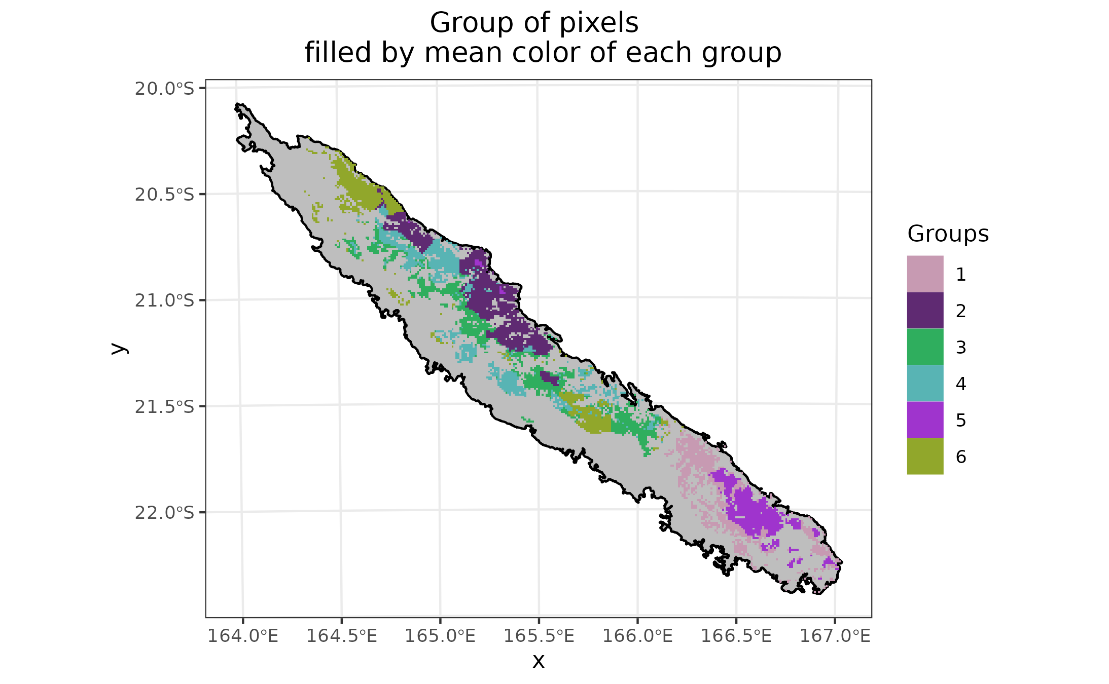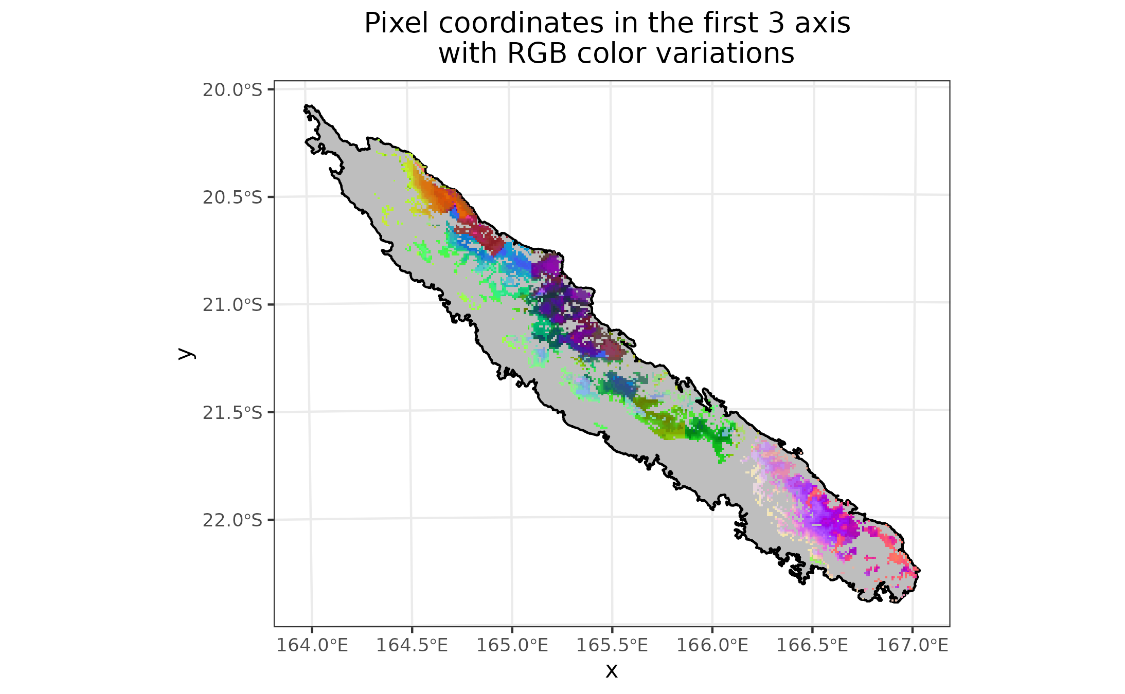 save_plot_2d = TRUE)Plot New Caledonia map with values in of the first three axis of PCA or tSNE method for each pixel. To see impacts of each axis on pixels. Those plots have different colors (Red, Green, Blue) for each axis of PCA or tSNE. To see diversity \(\beta\), display three plots in one. This plot in a RGB plot, similar colors are pixels with similar trees communities. Plot groups on New Caledonia map with mean color of each group.
